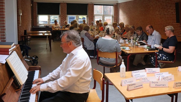Vi synger fra Højskolesangbogen og Salmebogen - og er så heldige, at organist Erik Lauge Mikkelsen akkompagnerer til sange og salmer, når det passer ind i hans program.